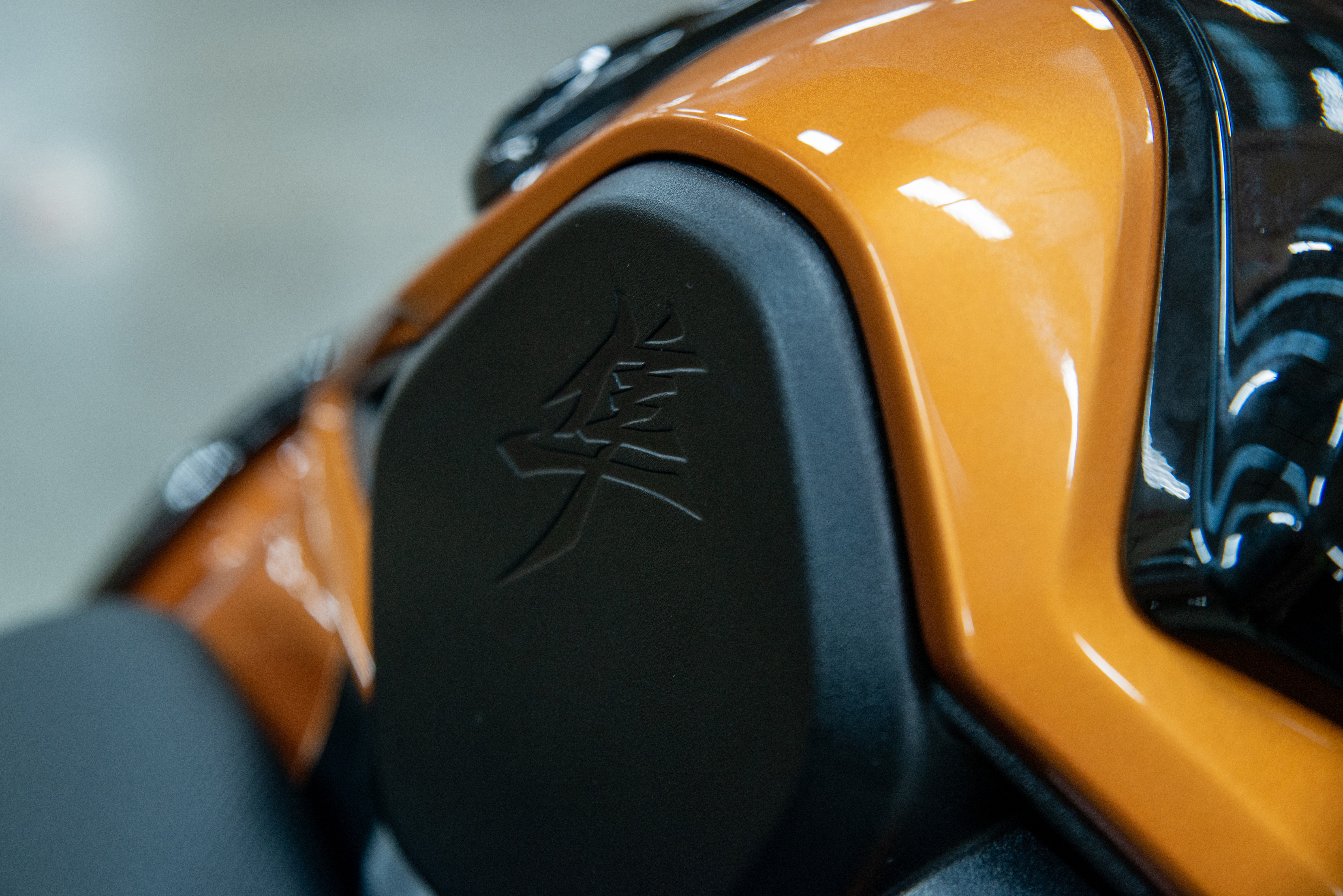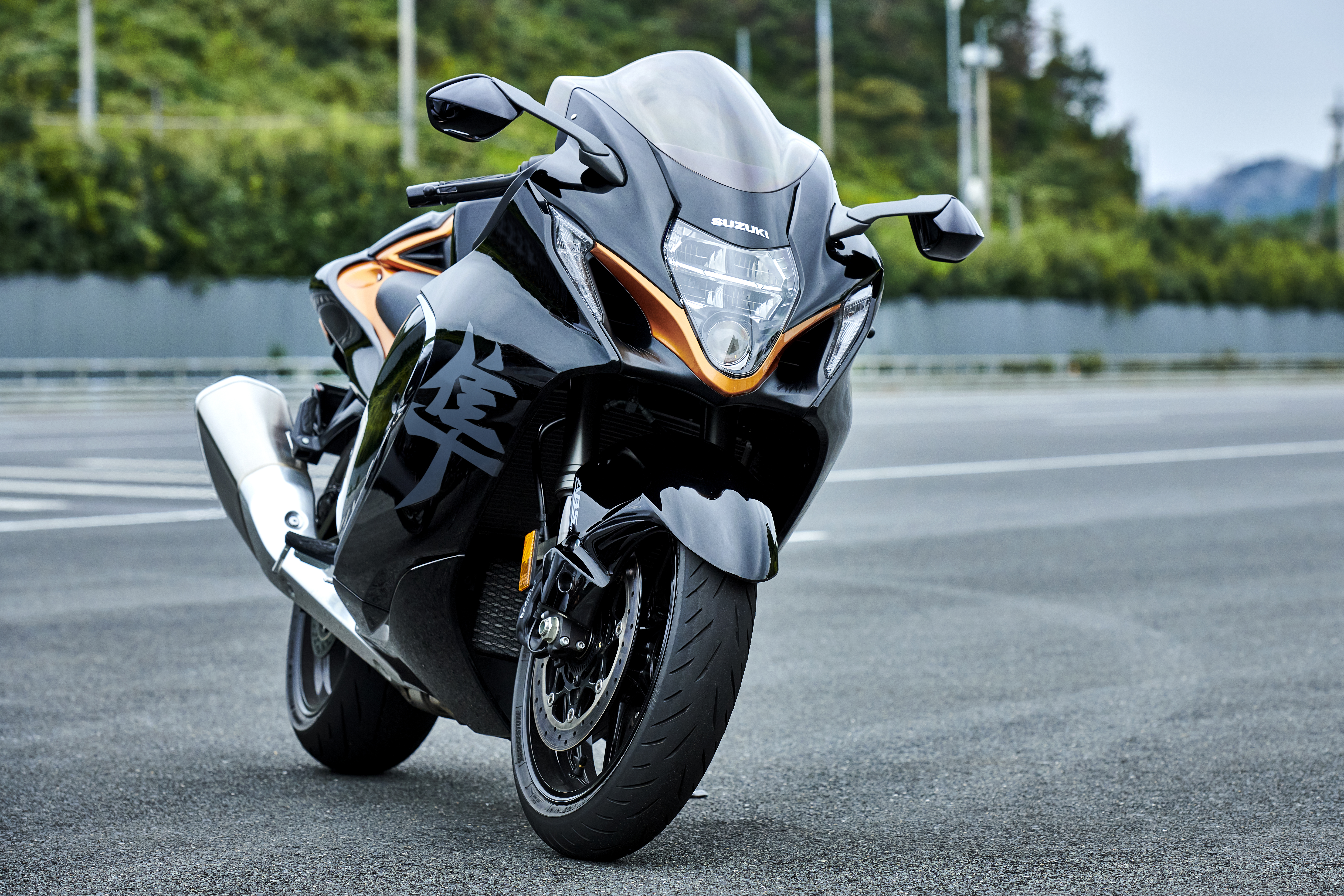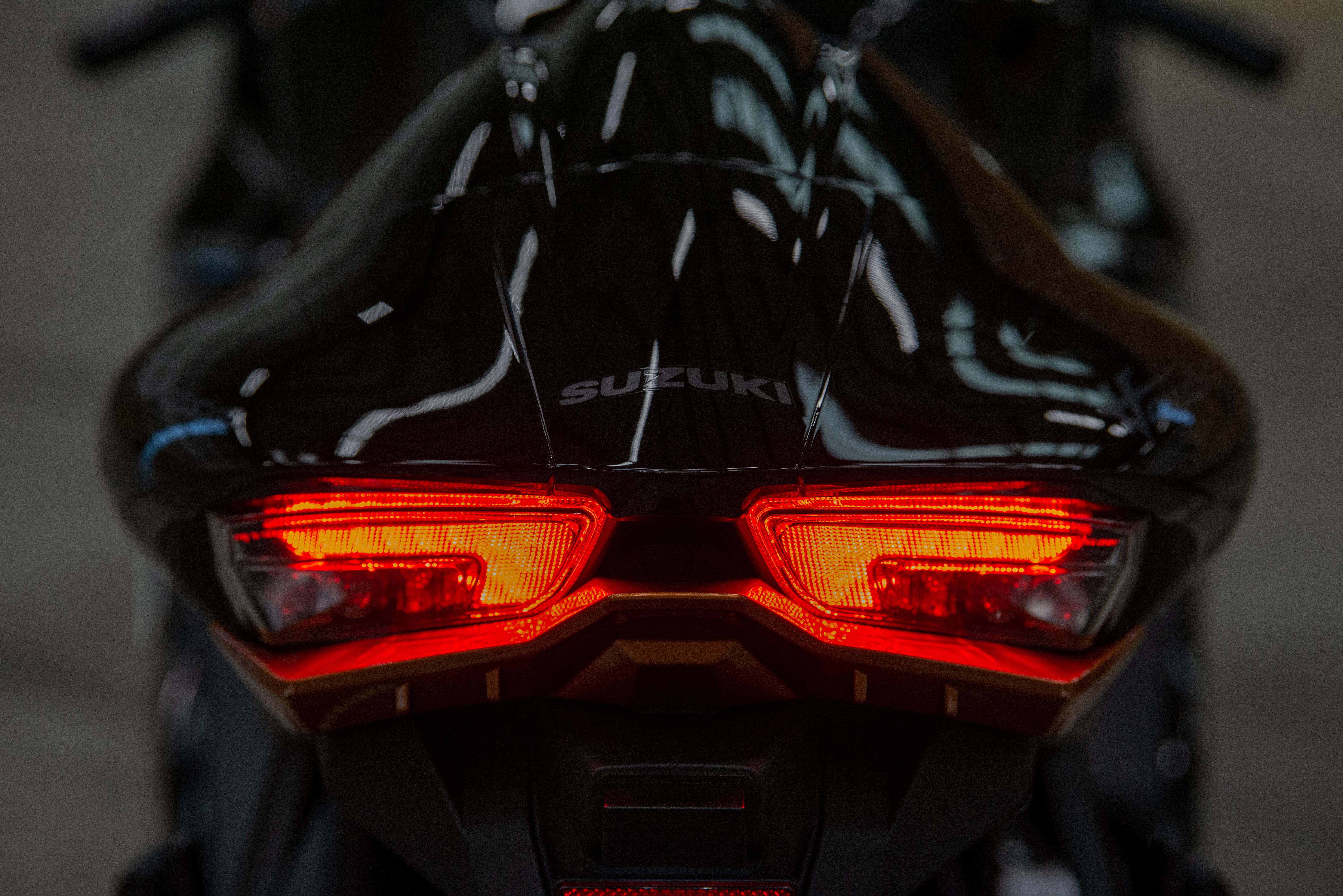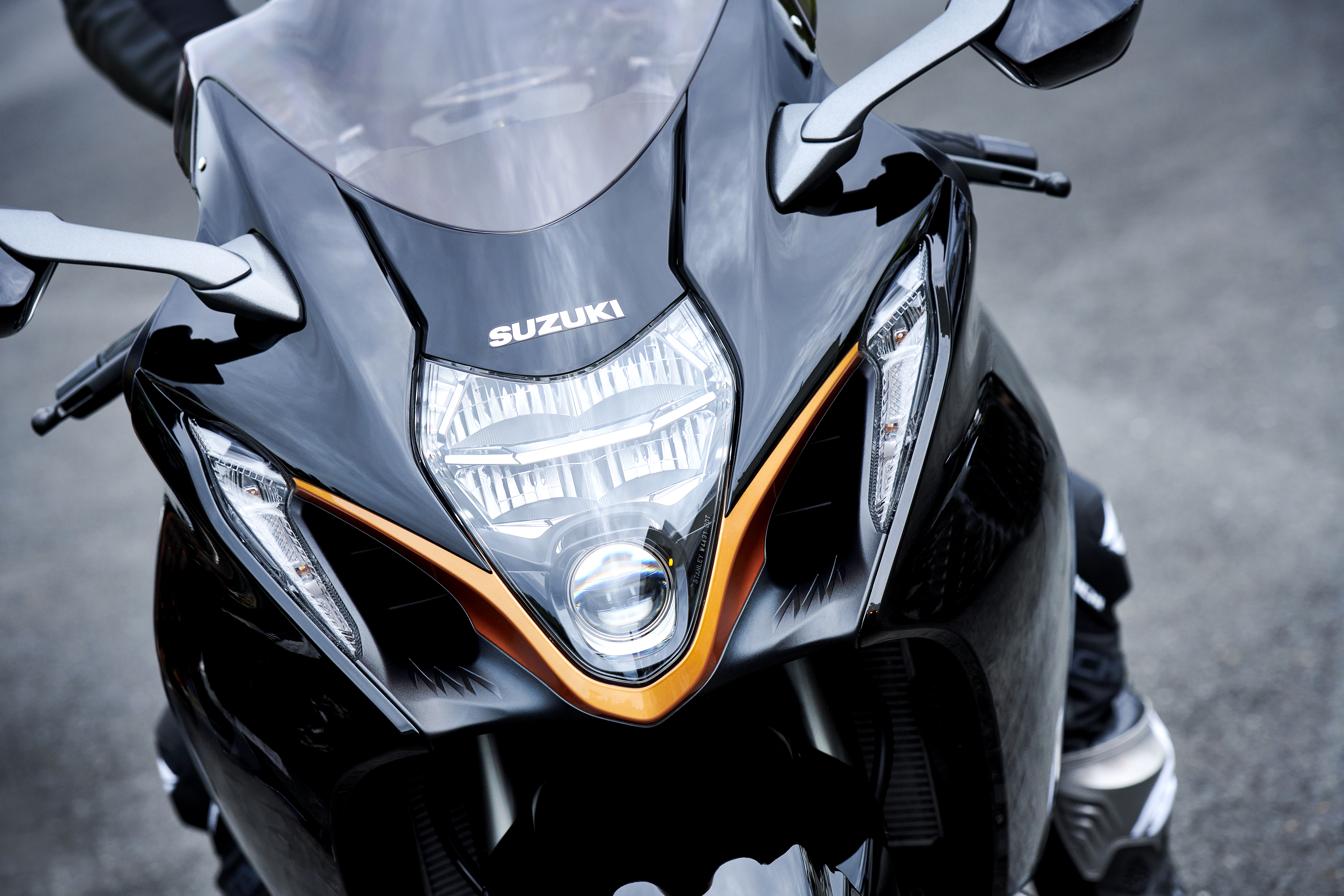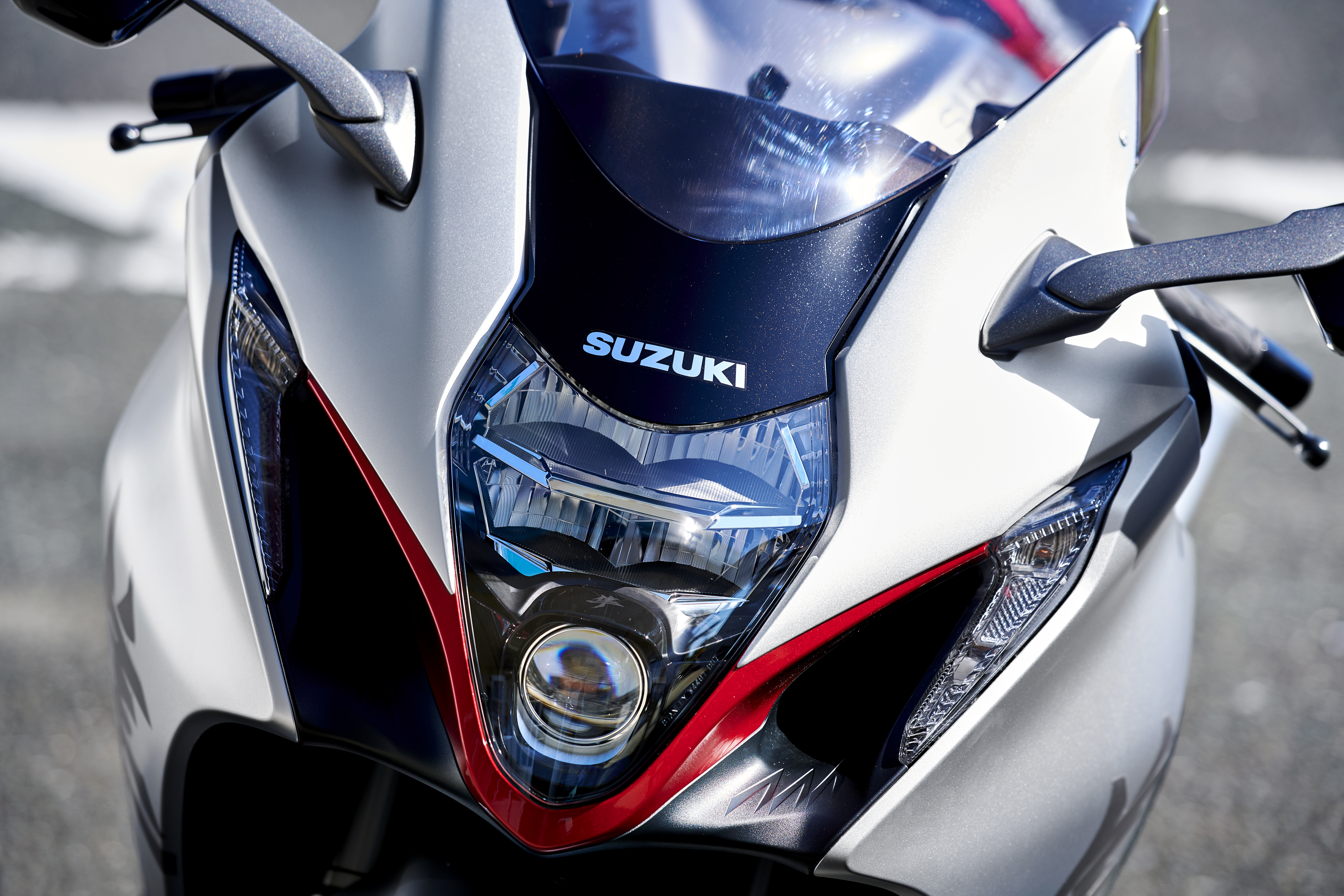 The side profile looks every inch Hayabusa, but the design features straighter, sharper lines, from the new mirror design to the famous seat hump. A fresh face comes from new vertically stacked LED headlights, nestled between the new angular air intakes. New position lights flanking the scoops double up as integrated turn signals.