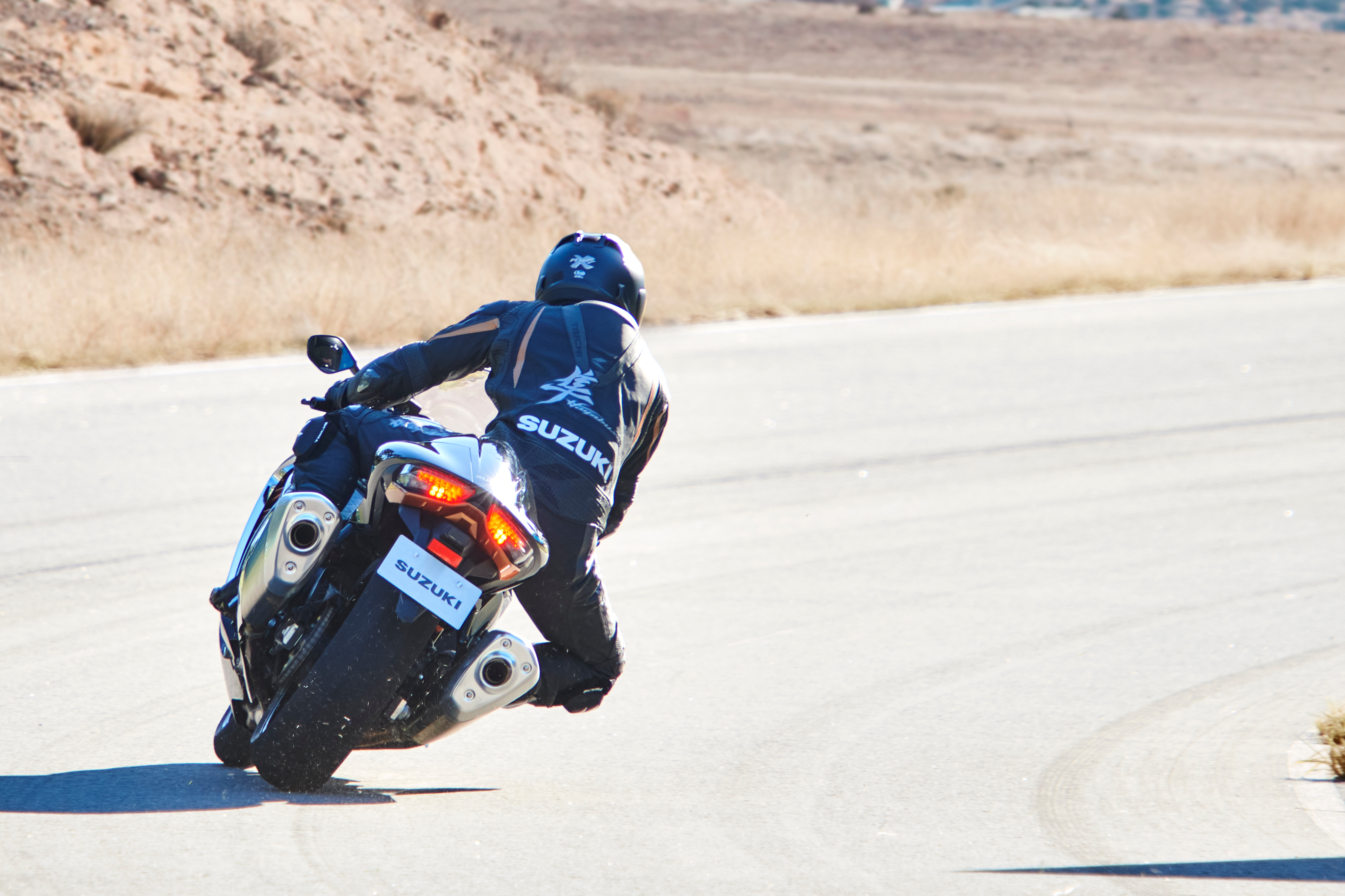 New air intakes reduce pressure loss and increase flow into a larger airbox, which ups capacity from 10.3 to 11.5 litres, and while retaining the bold, twin muffler design the Hayabusa is known for, a new exhaust system saves over 2kg over the previous system, as a new pipe connecting cylinders one and four helps delivery more bottom end torque. A new two-stage catalytic converter replaces the previous single-stage design to help meet Euro5 emissions standards.