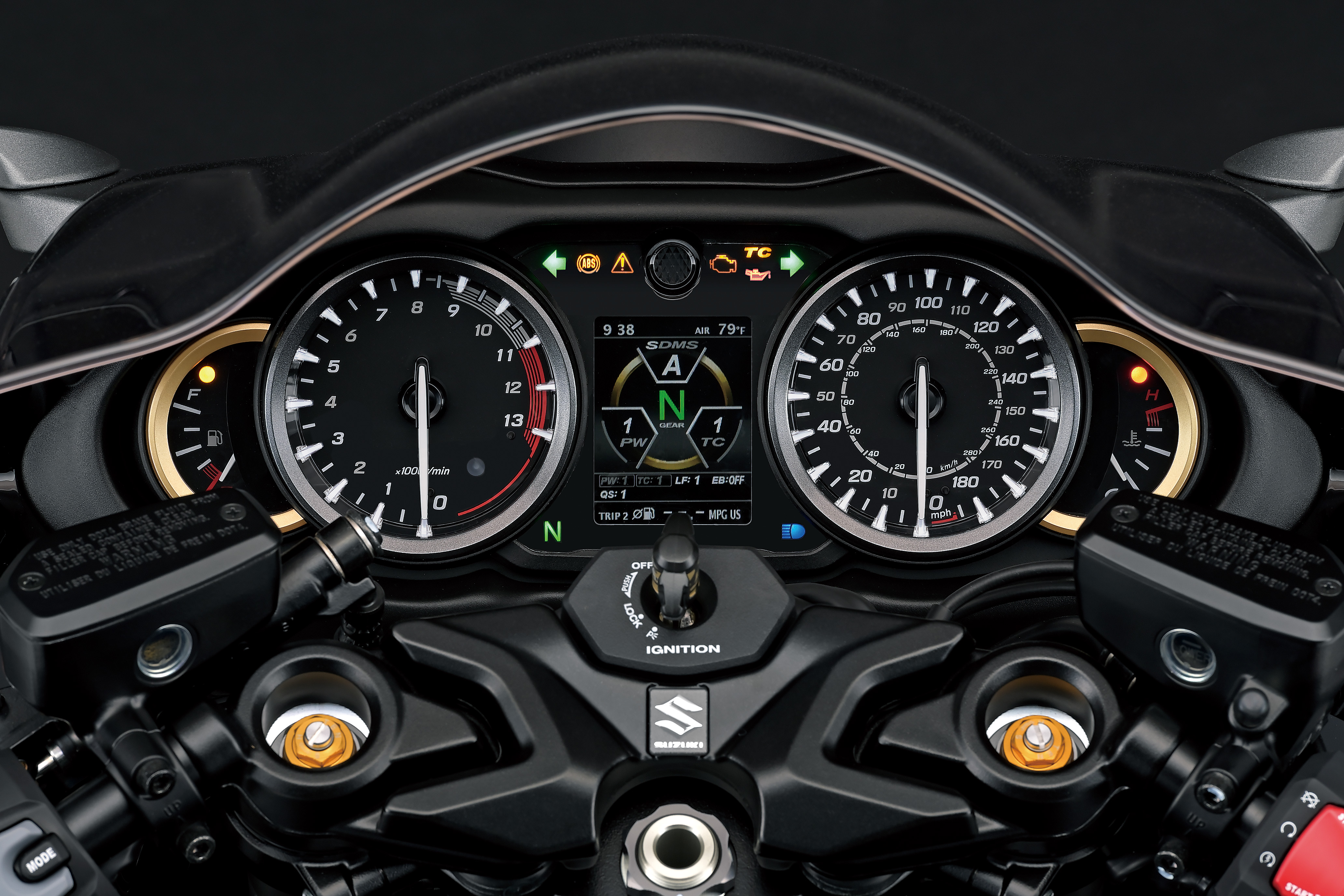 The colour TFT screen displays a plethora of information readouts from the new Hayabusa’s suite of electronics (described in full, below) including the current SDMS-α settings or an active data display that shows lean angle (with peak-hold function), front and rear brake pressure, rate of forward/reverse acceleration and the current accelerator position. The panel also shows clock, gear position, odometer, dual trip meter, ambient temperature, instant fuel consumption, riding range, trip time, average fuel consumption, and voltmeter displays. LEDs located in the corners above and below the LCD include the neutral indicator light, turn-signal indicator lights, high-beam indicator light, low oil pressure warning light, traction control indicator, malfunction indicator lamp, master warning indicator, and ABS indicator. There is also an LED engine coolant temperature indicator light in the upper right corner of the engine coolant temperature gauge and fuel indicator light in the upper left corner of the fuel meter gauge. An ambient light sensor automatically adjusts the instrument cluster’s brightness level based on surrounding conditions, or the rider can also opt to make manual adjustments.