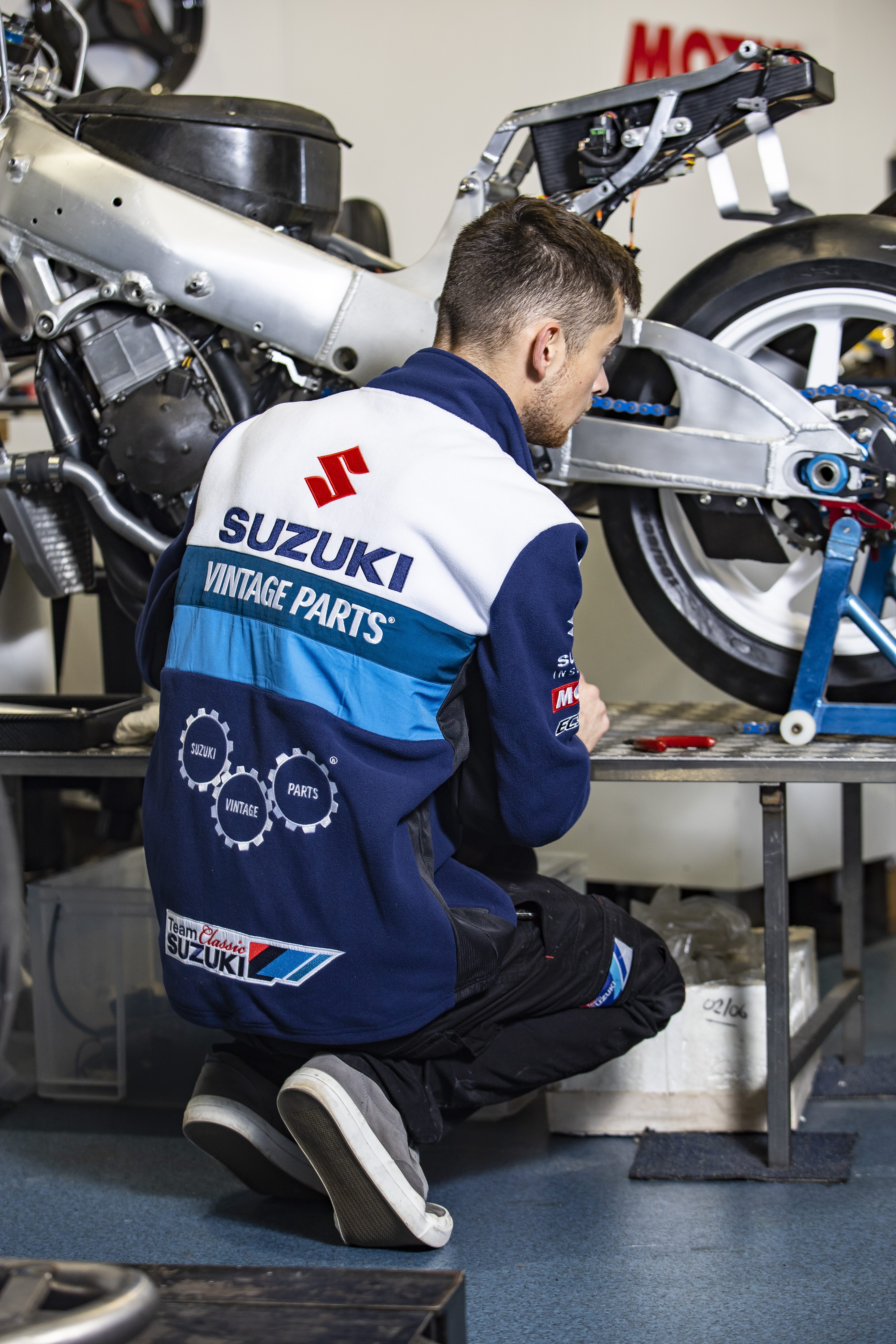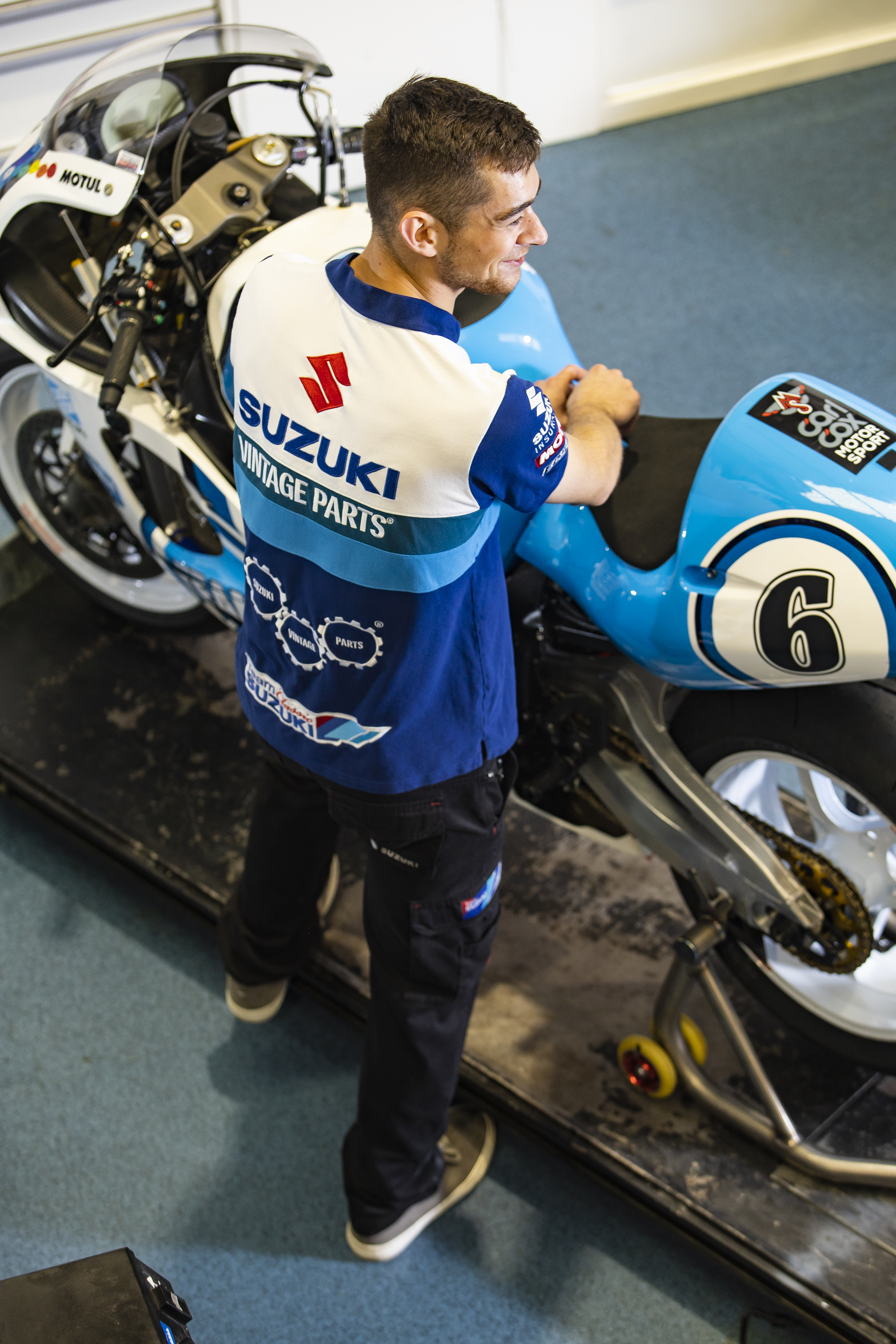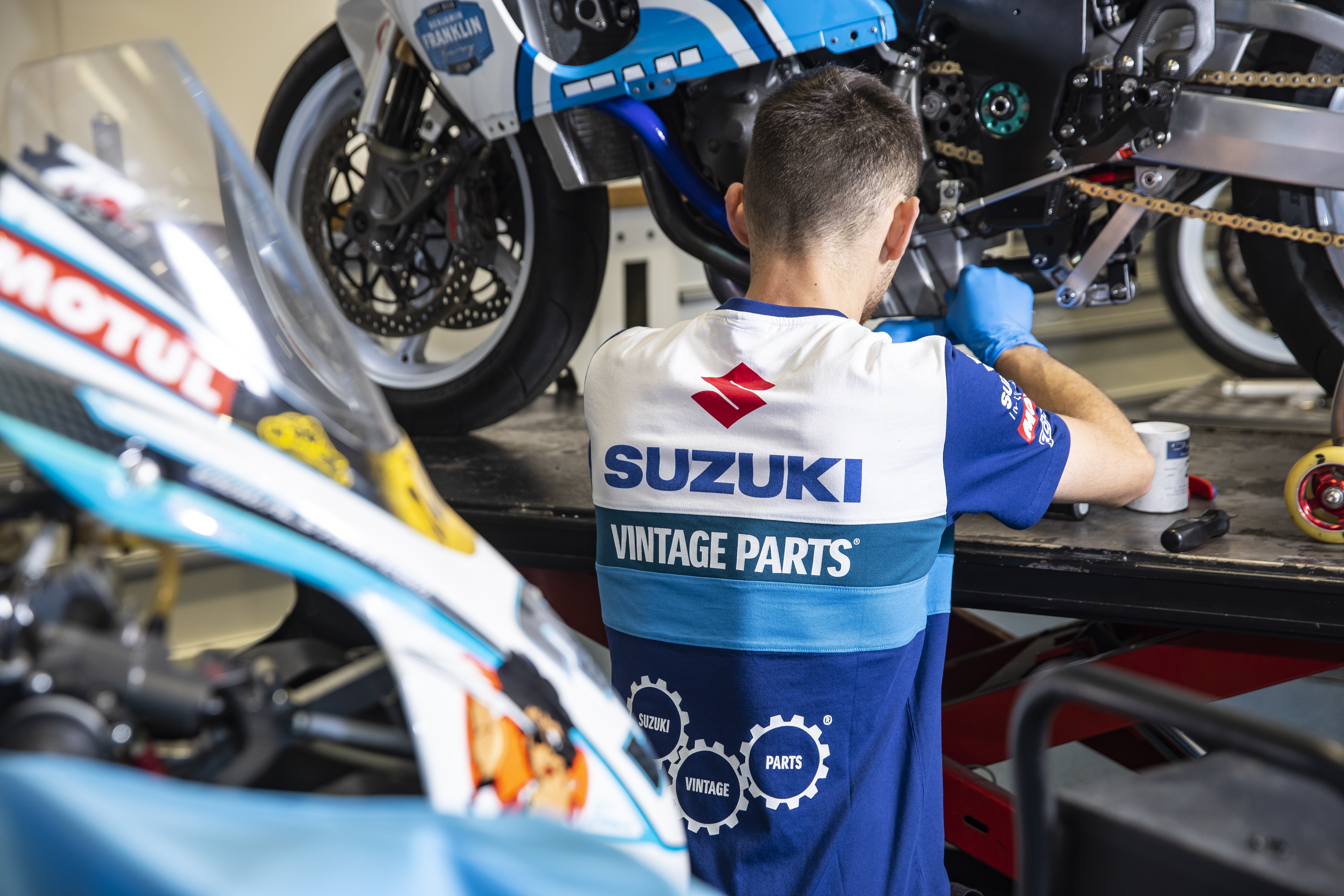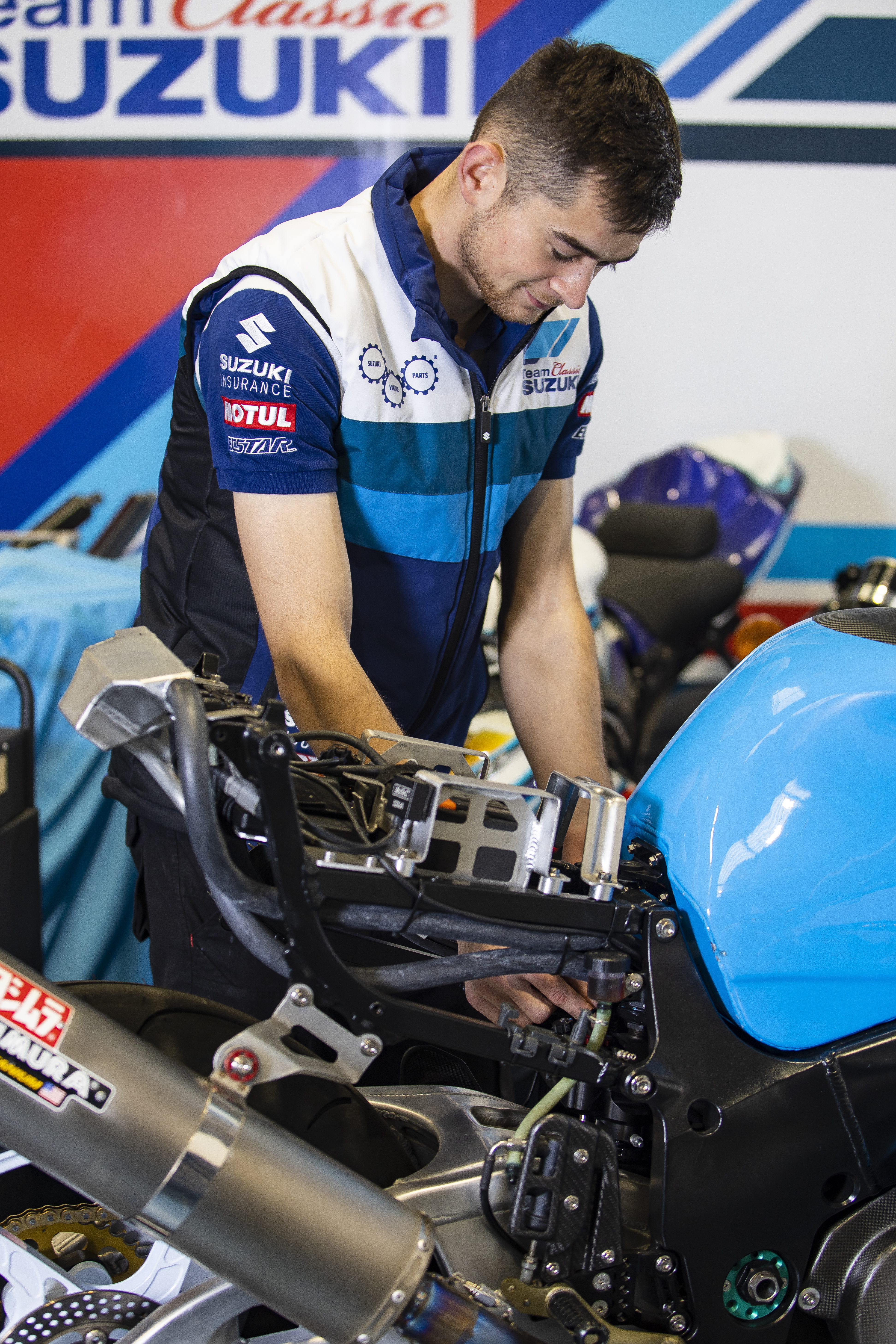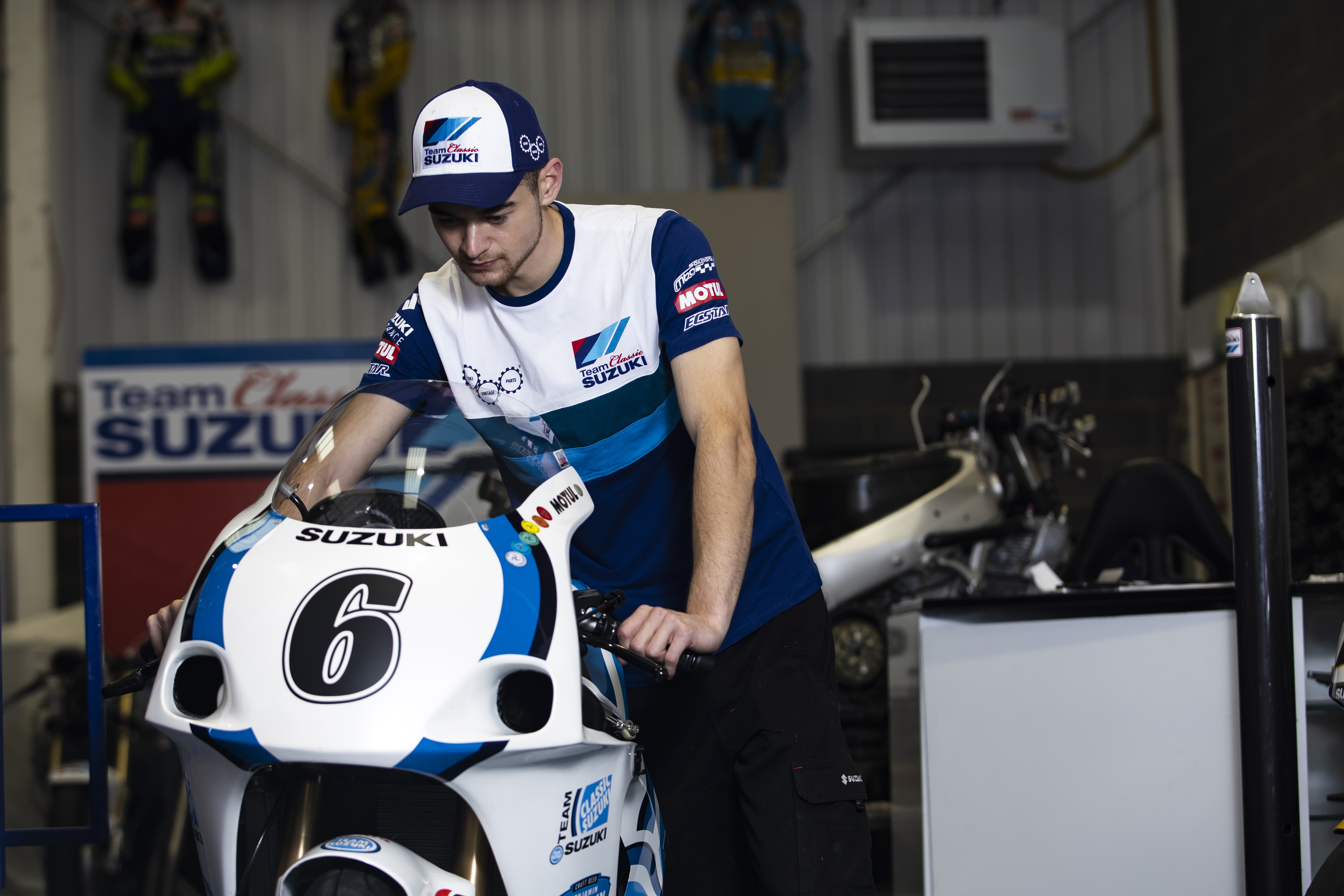 A new design takes cues from the team’s iconic race bikes and legacy liveries from Suzuki RGs and GSX-Rs, with the use of blocks and stripes in varying shades of blue and white, completed with sponsor logos including Suzuki’s Vintage Parts Programme, Motul, and Ecstar.