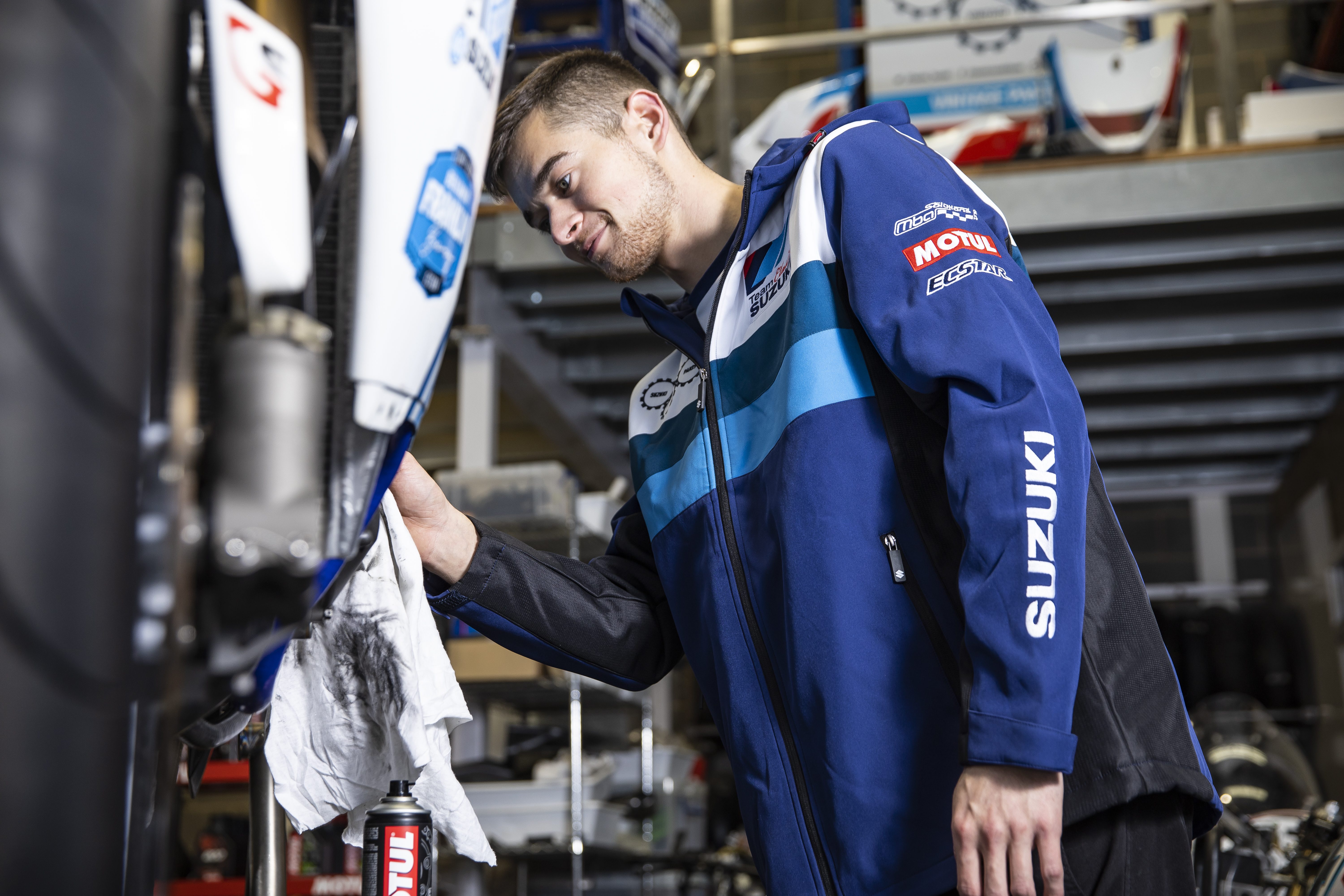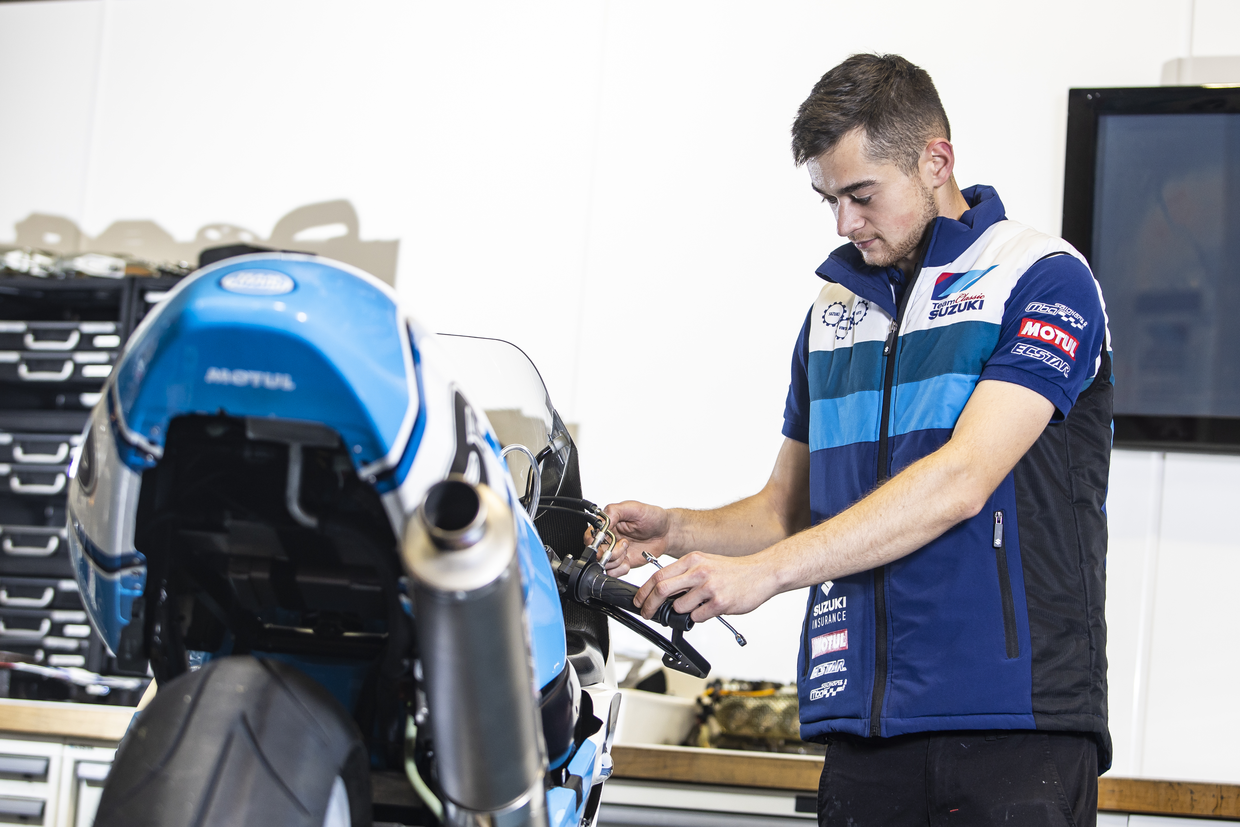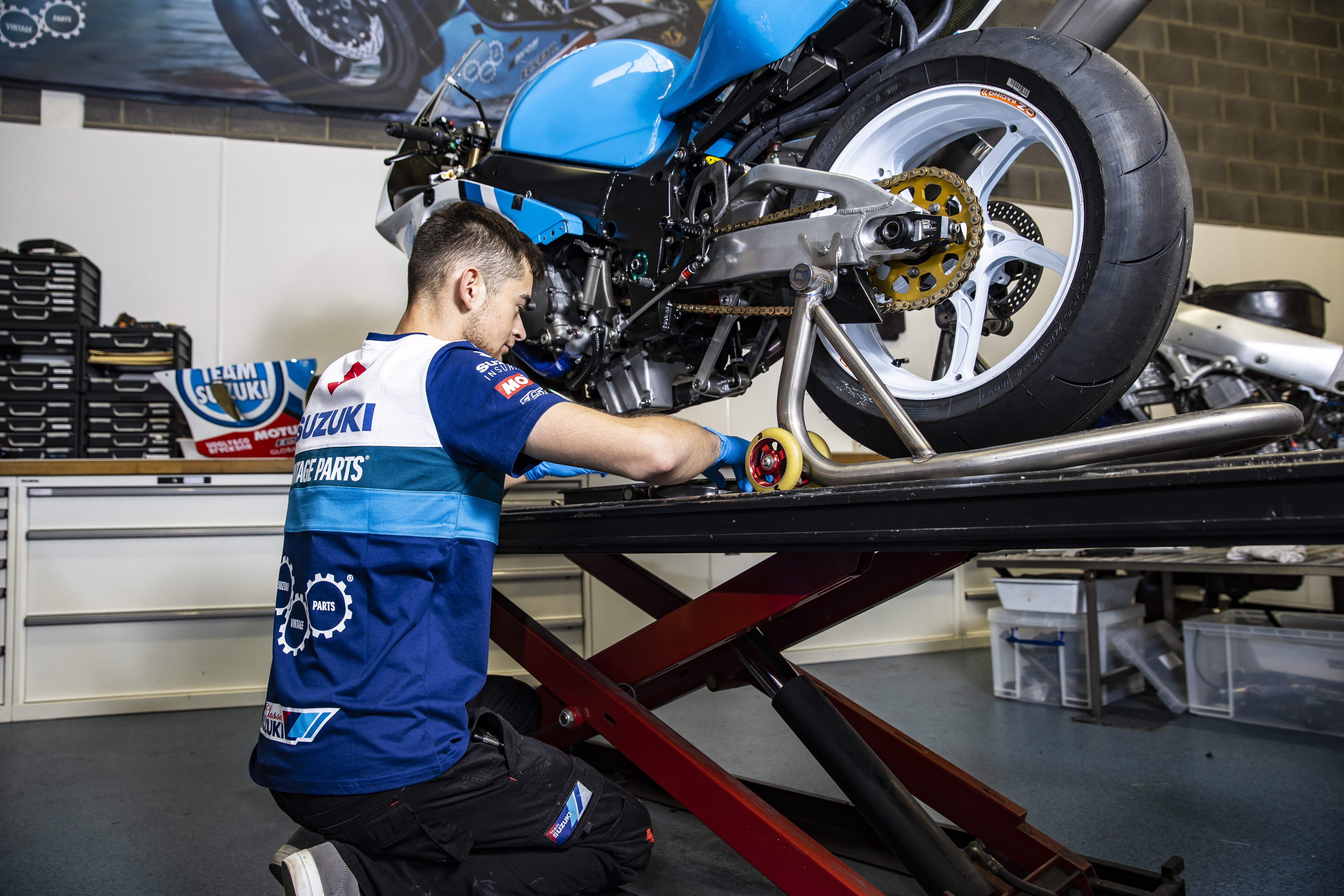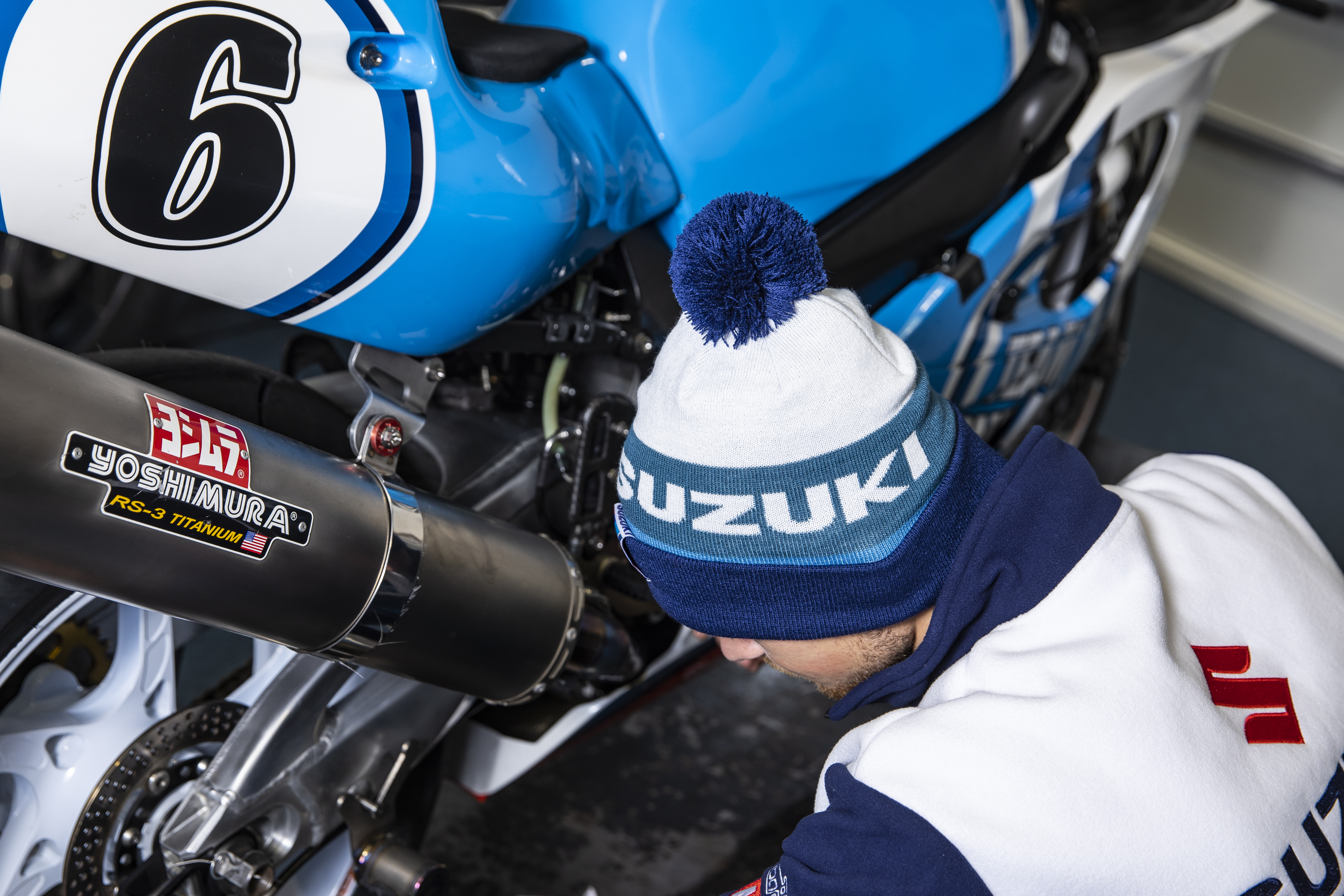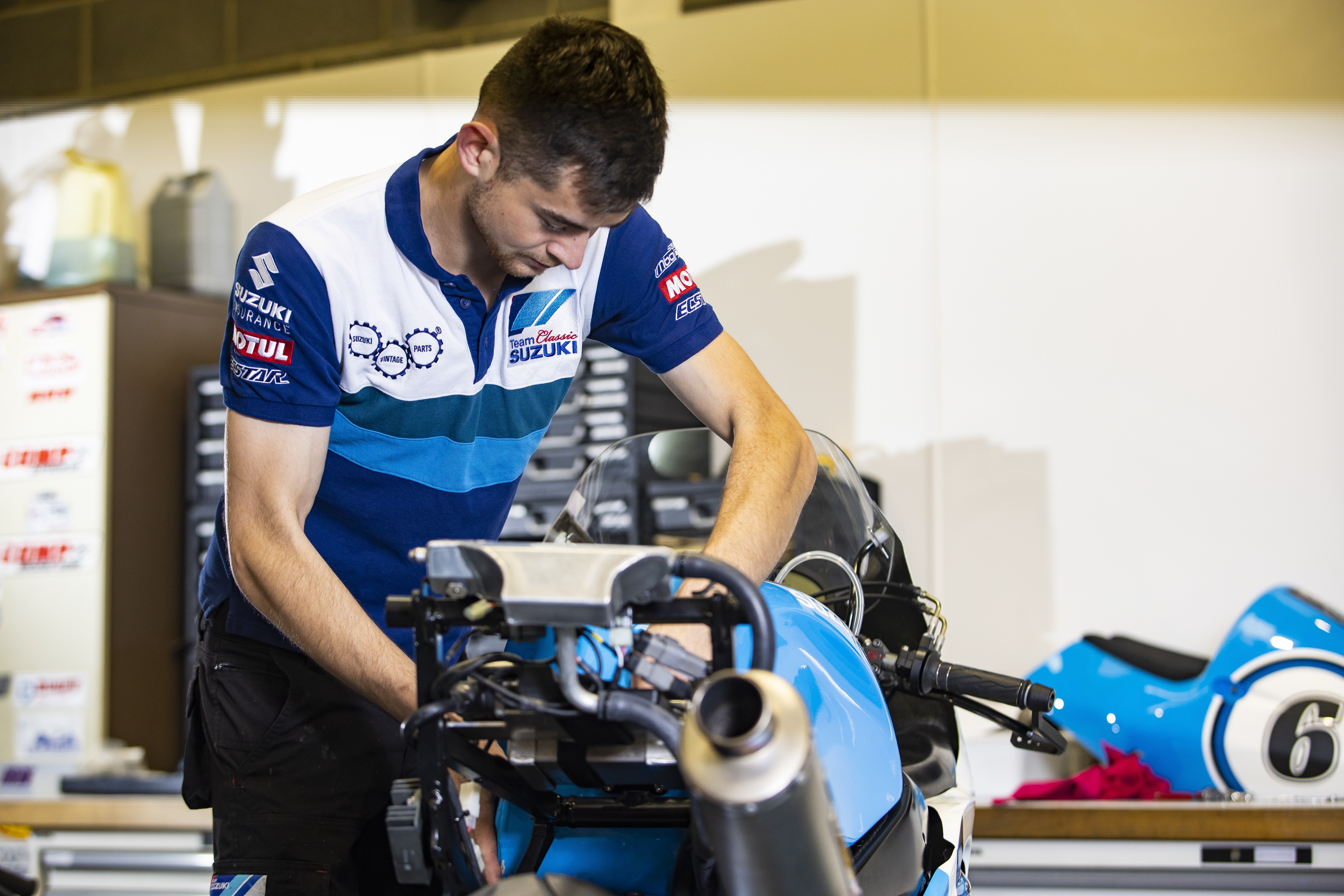 A new design takes cues from the team’s iconic race bikes and legacy liveries from Suzuki RGs and GSX-Rs, with the use of blocks and stripes in varying shades of blue and white, completed with sponsor logos including Suzuki’s Vintage Parts Programme, Motul, and Ecstar.