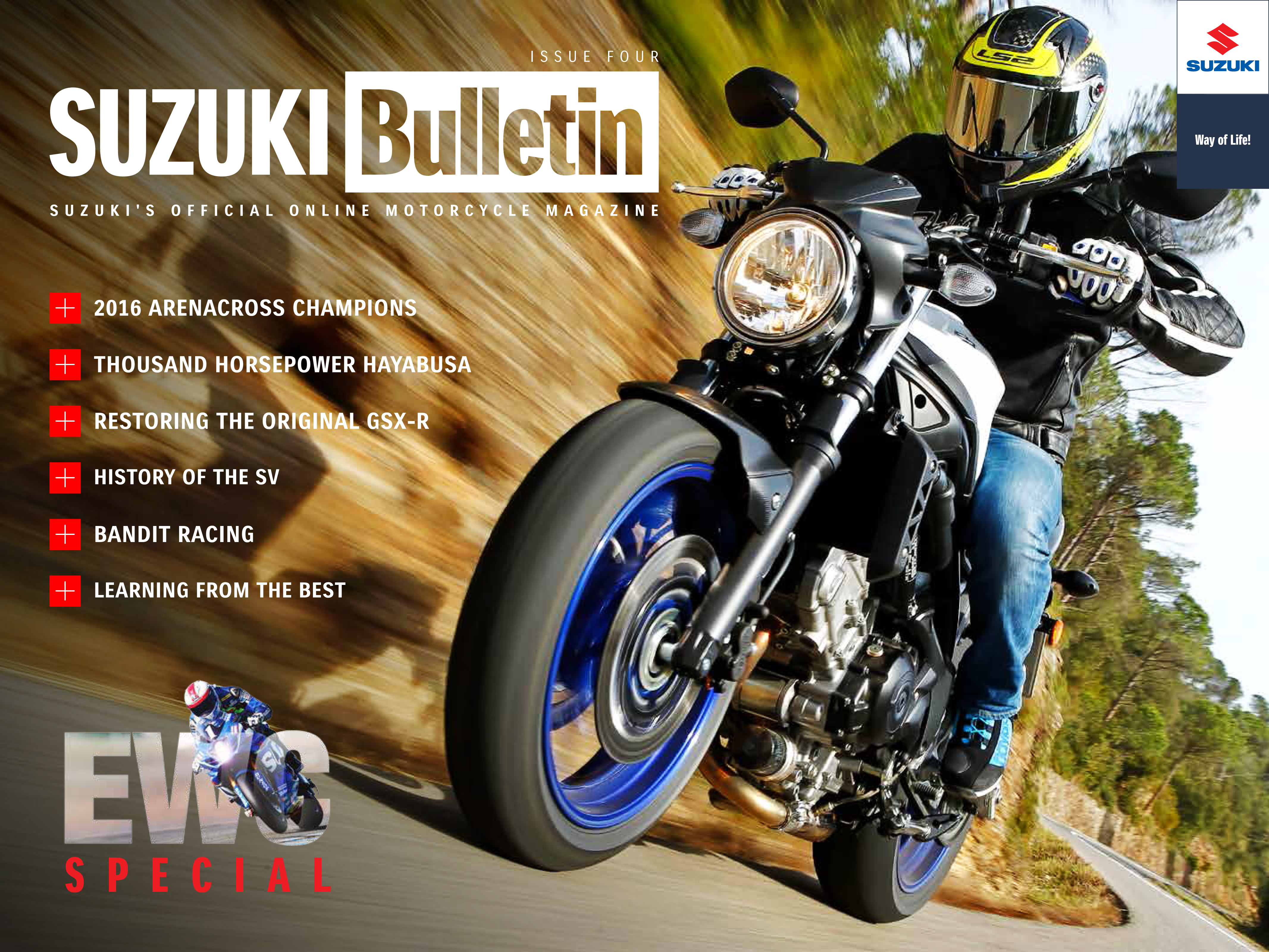 The newest issue features a video with former British and world championship racer-turned-commentator, James Whitham, discussing his instructions schools and techniques for riding on track, as well as the videos of the GSX-R750F restoration from Motorcycle Live, Thomas Ramette’s win in the 2016 Arenacross championship, and a look behind the scenes during testing of the new SV650.