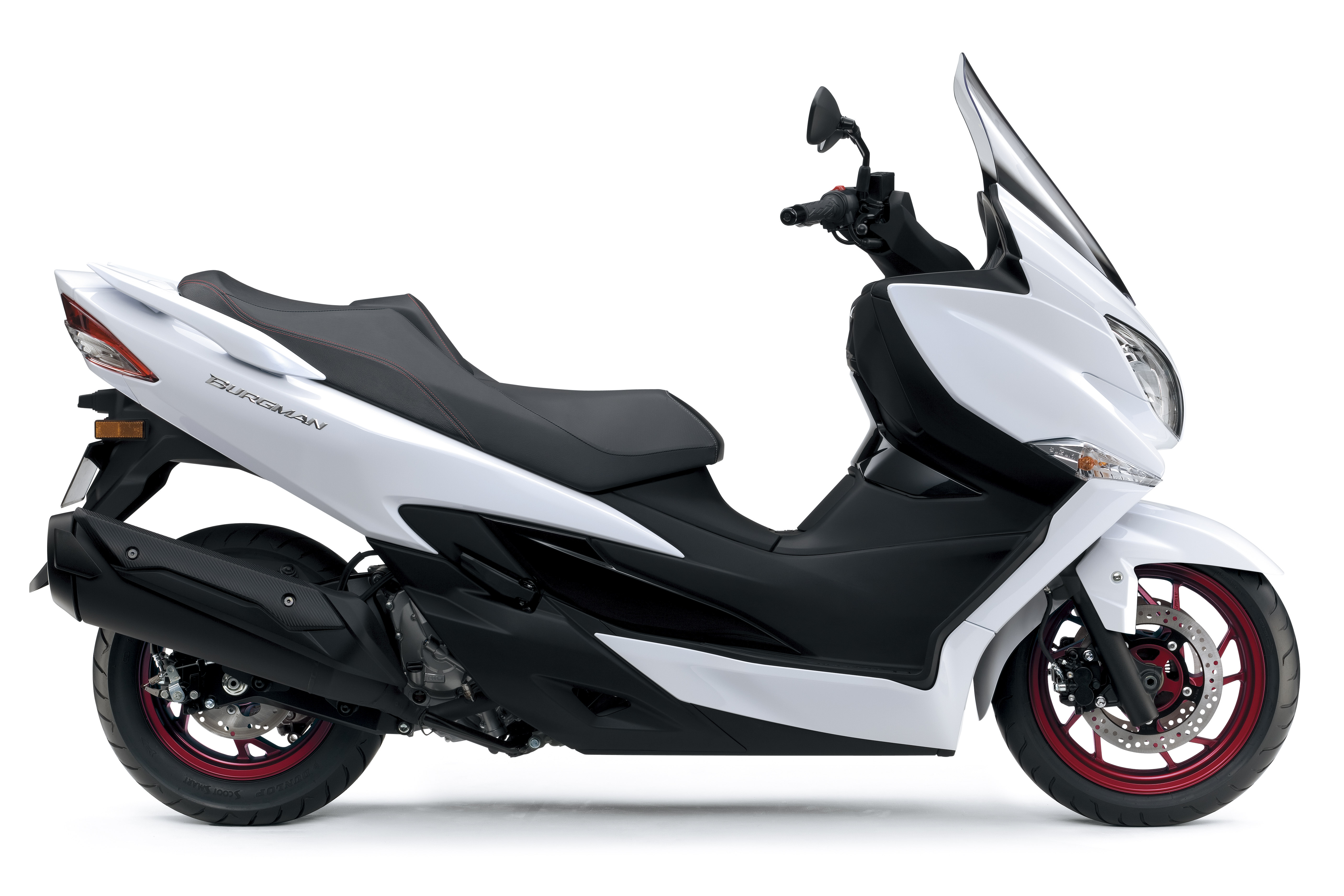 The stylish and original maxi-scooter, the Burgman 400, is available in a dark matt blue that oozes luxury, plus a pure white edition and all-black model that both feature sporty, dark red wheels. The learner-friendly Burgman 125 is available in black or white.