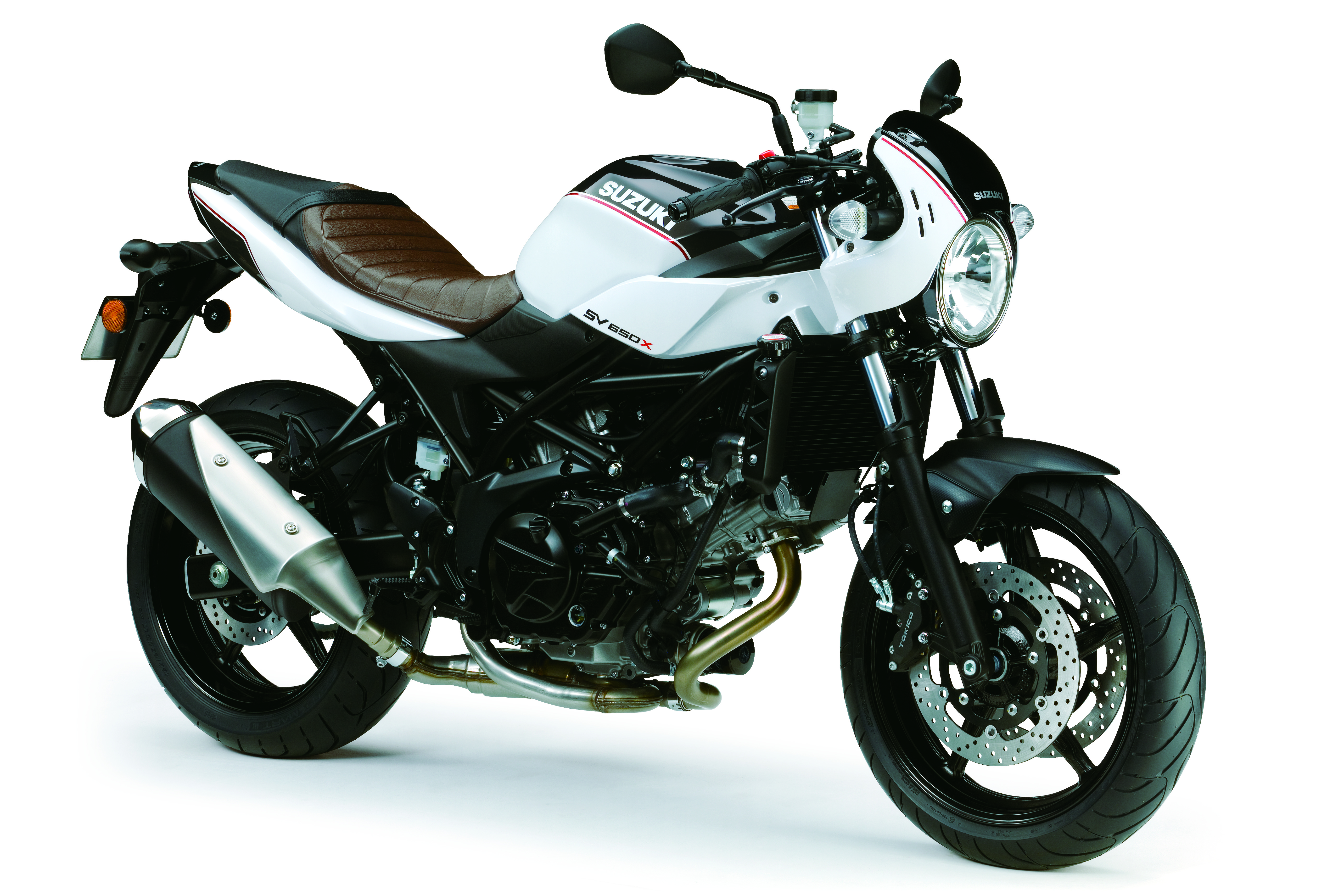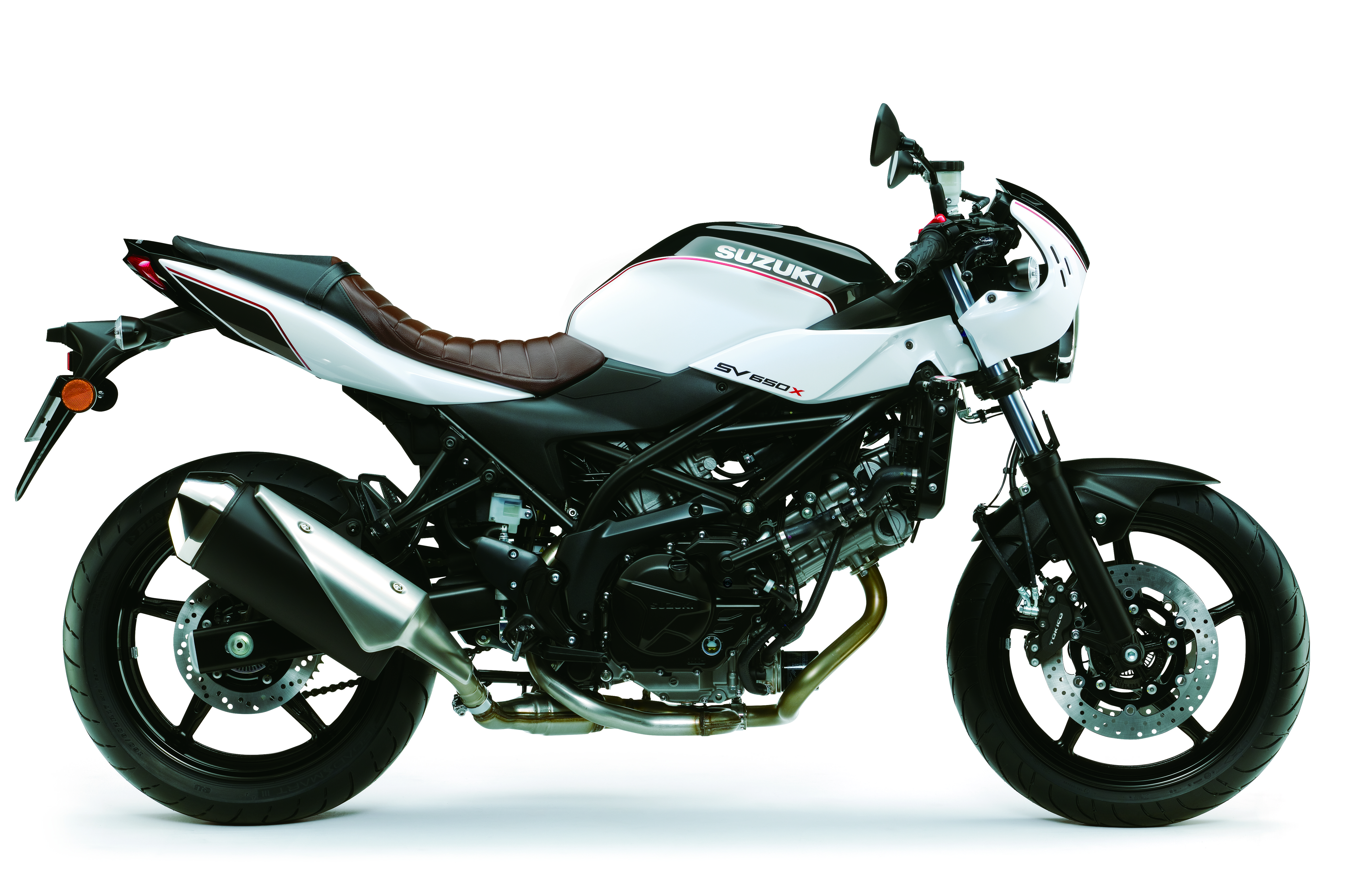 The SV650X – which gets café racer styling and lower clip-on handlebars for an even sportier riding position – comes with a new brown tuck-roll seat with a white and black retro livery. Both models also benefit from an upgrade to new four-piston front brake calipers in 2019.